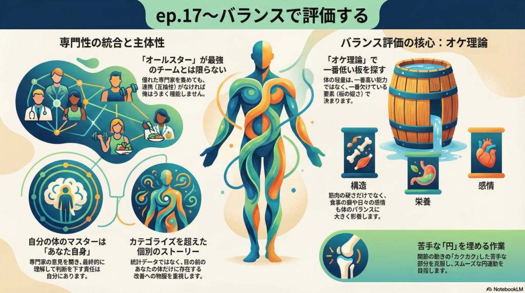 • 結論: 人より優れている「得意な部分」を伸ばすことも大切ですが、全体の容量(パフォーマンスや健康)を上げるためには、「一番低い板(苦手な部分・マイナス要素)」を少しずつ底上げしてバランスを整えることが、怪我の予防や人生の質の向上に不可欠であると結論付けています