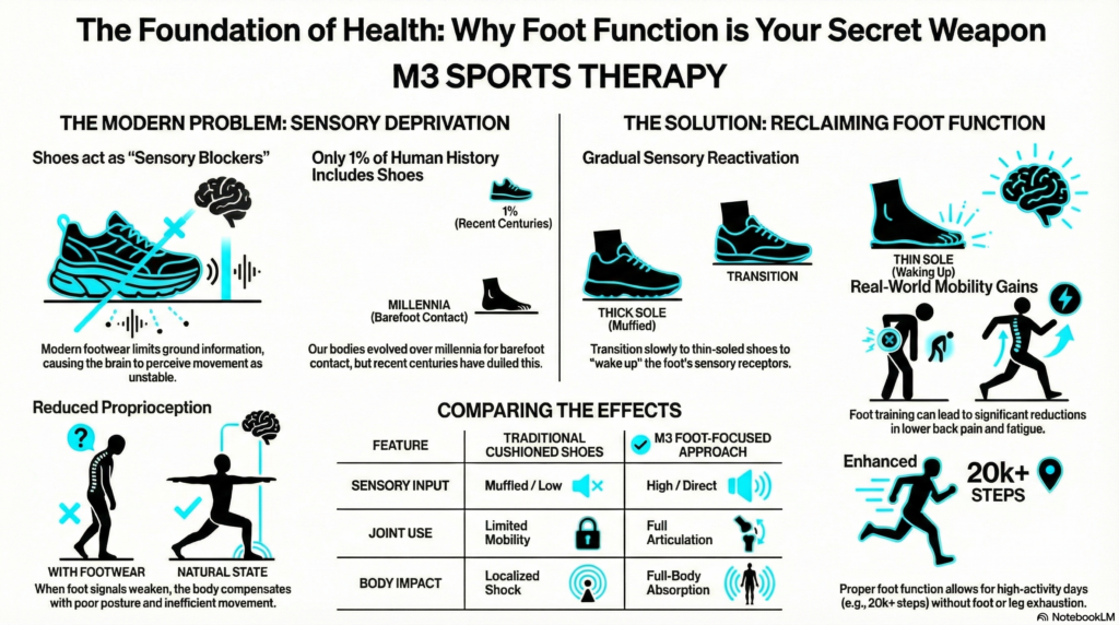 If you were walking on jagged rocks or hot sand, your feet would instantly send signals to your brain to walk carefully. This sensory feedback creates stability for the knees, hips, and the entire body. However, in modern life, we constantly wear socks and cushioned shoes, which dulls these sensors and blocks vital information from reaching the brain.