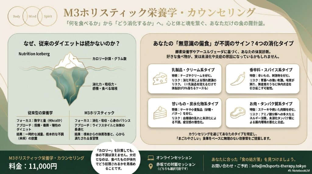 「自分のボディタイプを知りたい」「カロリー制限をしているのに不調が治らない」とお悩みの方は、ぜひM3 Sports Therapyのホリスティック栄養学カウンセリングをご利用ください。